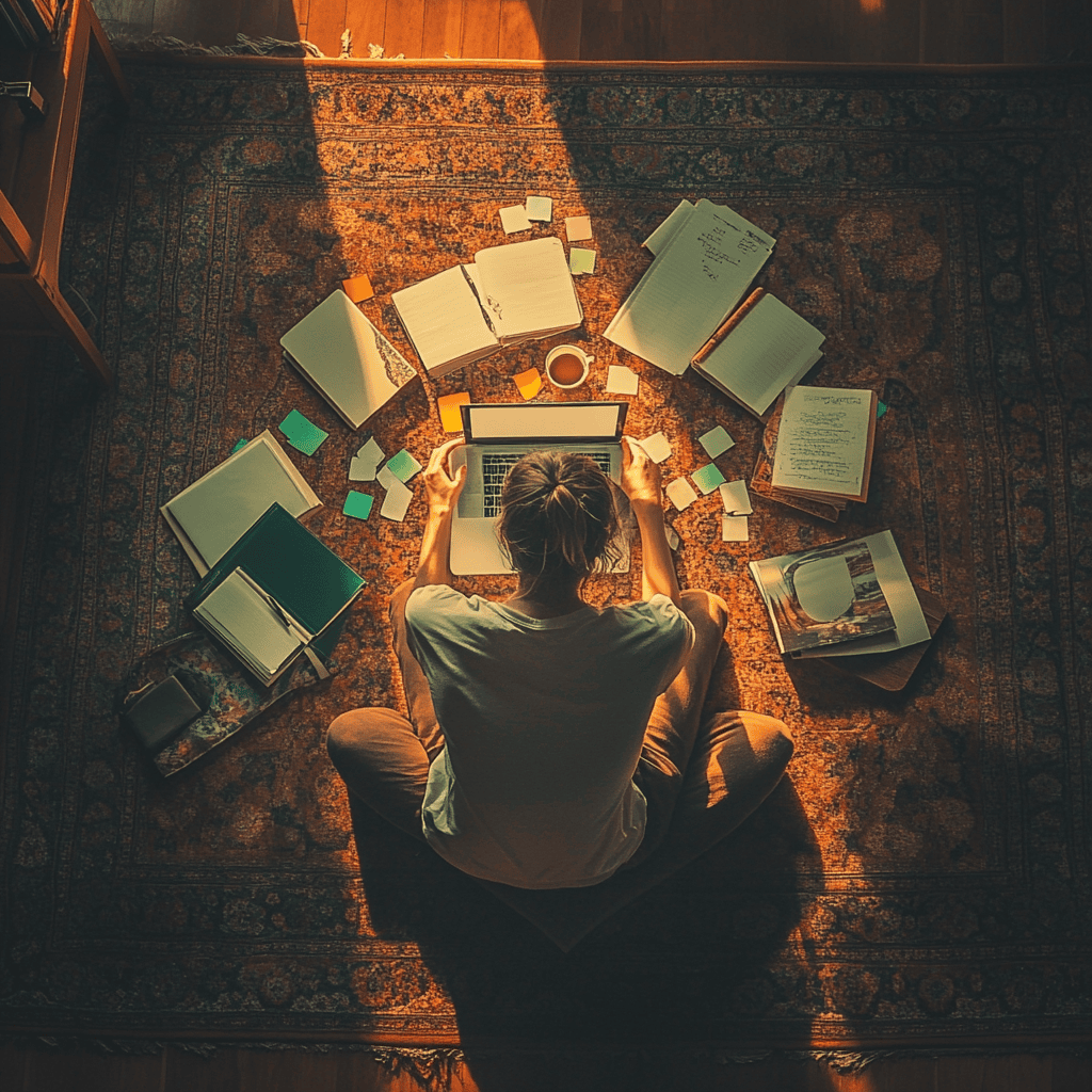 I encourage you to break free from what you think you should do and listen to what actually works for you. Forget the rules or advice about where and how writers are supposed to work. Maybe you find your most creative self in the park, at a bustling café, or sitting on the floor like me. Writing is such a personal process, and figuring out what suits your style can lead to breakthroughs in your creative journey.